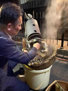 日本でも、サンマルティーノを普及したいと考え、10年以上前から、京都市内の老舗天ぷら店の天喜さんで、ボジョレーヌーボー解禁日に、焼栗とワインの会をやっています。