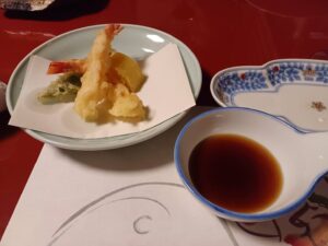 天麩羅、ブリの炭火焼き、和え物、鯖寿司など沢山の料理が出ました。